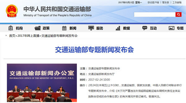 2017年2月24日上午10时,交通运输部举行了本年度第一次例行新闻发布会,本次专题发布会由交通运输部、国家发改委、中国人民银行联合举行,介绍《关于对严重违法失信超限超载运输车辆相关责任主体实施联合惩戒的合...
