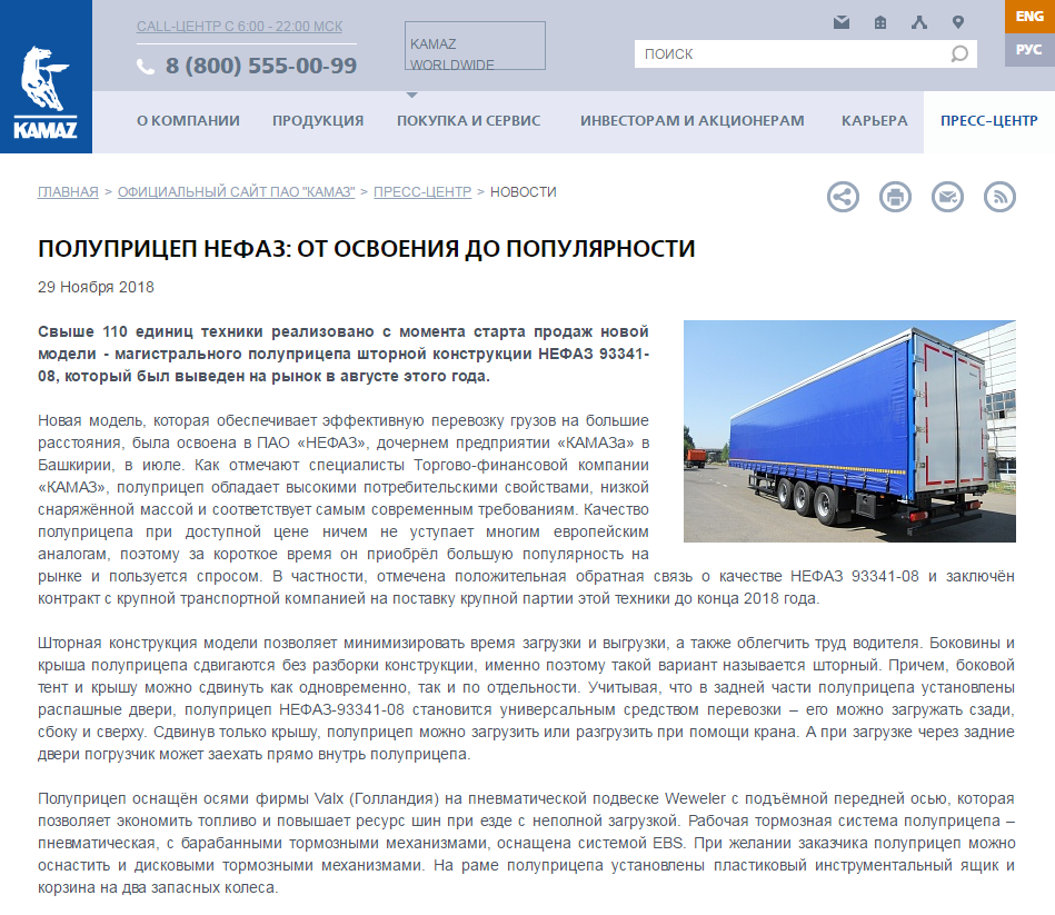 原文翻译如下: 作为侧帘半挂车的新车型,NEFAZ 93341-08自从今年8月份推出市场以来,累计销量已经超过110台。 这款新半挂车是今年7月在PJSC NEFAZ生产,PJSC NEFAZ是KAMAZ的子公司。这款半挂车能为货物提供有效的长距离运输。按照KAMAZ公司的介绍,这款半挂车具有很高的性价比,轻量化设计,完全符合现代化物流的要求。由于它价格实惠,质量好,因此这款半挂车比许多欧洲同类产品都更有竞争优势,所以它在短时间内在市场上获得了极大的欢迎并且需求量很大。特别是市场上有关NEFAZ 93341-08质量的积极反馈,并且与许多大型运输公司签订了大批量交付的合同,订单直至2018年底。 这款侧帘半挂车的设计让装卸货的时间最大限度地减少,而且方便司机的操作。由于这个原因,车厢的侧面和车顶在不用拆除的情况下可以移动,这种设计被称为侧帘。并且,侧遮阳篷和屋顶可以同时移动,也可以单独移动。考虑到在半挂车后部有个车门,半挂车NEFAZ-93341-08成为运输的通用改进措施——它可以从车厢的后面,侧面和上面装载。在仅移动车顶之后,可以通过起重机装载或卸载货物。当通过后门装载时,叉车可以直接在半挂车中出现。 这款新型侧帘半挂车配备了ng电子沃胜VALX车轴,前轴配合带提升装置的空气悬挂,可以在空载的情况下节省燃油并延长轮胎的使用寿命。半挂车的制动系统是鼓式气动制动,配备EBS。如果需要,客户也可以为半挂车选用带盘式制动的VALX车轴。另外,在半挂车的车身上带有塑料工具箱和两个备用轮胎。